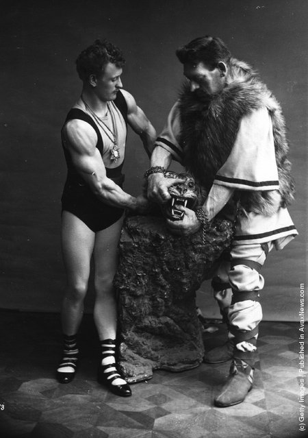 German athlete Eugene Sandow and Goliath (Photo: Hulton Archive/Getty Images). About 1910.
