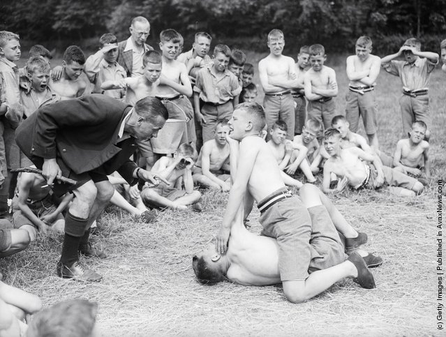 Friendly wrestling match in summer camp Ingham Old Hall (Norvich). (Photo: Fred Morley/Fox Photos/Getty Images). July 3, 1934.