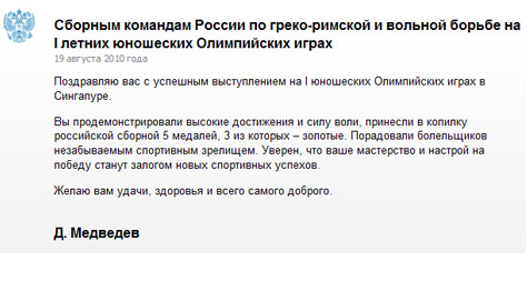Президент России Дмитрий Медведев поздравил членов сборных России по греко-римской и вольной борьбе с успешным выступлением на проходящих в Сингапуре юношеских Олимпийских играх.