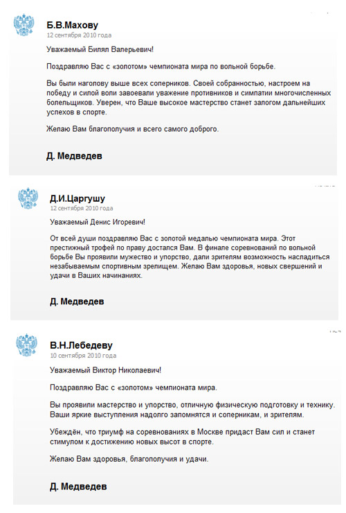Президент России Дмитрий Медведев поздравил российских борцов с победами на чемпионате мира по вольной, греко-римской и женской борьбе, прошедшем 6-12 сентября в Москве. Сборные России завоевали на чемпионате мира 5 золотых, 3 серебряные и 8 бронзовых медалей.
