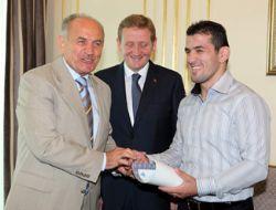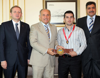 Мэр Стамбула Kadir Topbas наградил Чемпиона мира Selçuk Çebi в весовой категории 74 кг по греко-римской борьбе.